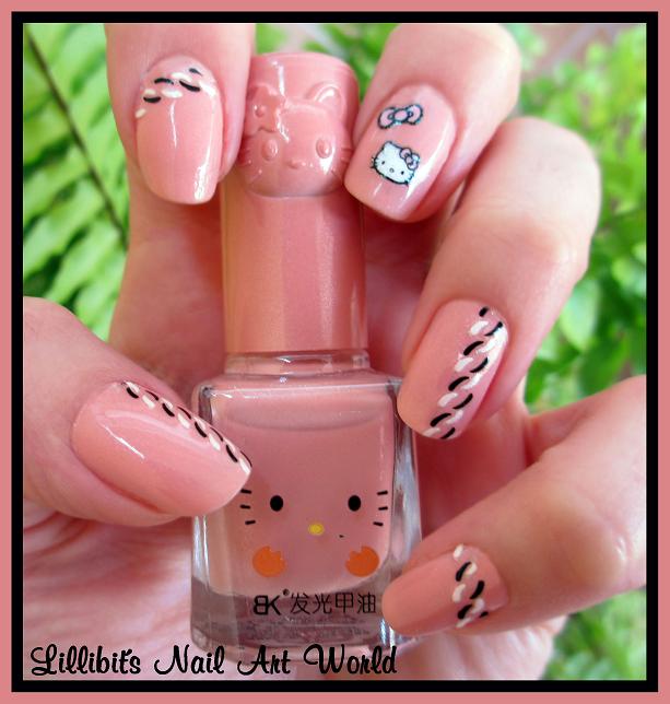 Como veis, he hecho una manicura lo más a juego que he podido con el bote: unas stickers de cadenitas negras y blancas y ¡no podía faltar Hello Kitty con su lacito característico en una de las uñas! Aquí se ve mejor la manicura: