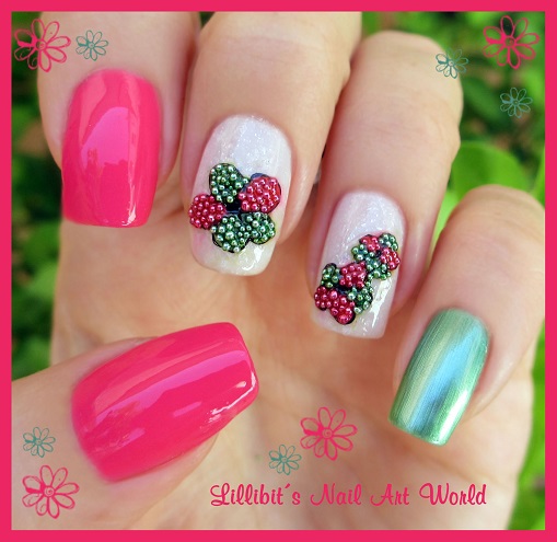 Como estáis viendo, me busqué los esmaltes fucsia y verde más parecidos que tengo a estas bolitas. Pinté de fucsia el pulgar e índice y de verde el meñique. En el centro de la manicura (corazón y anular) apliqué una base de uno de mis preciosos Cliché Gel que compré en el verano. Y encima coloqué flores (reverses) con los pétalos coloreados en los dos tonos (alternando fucsia y verde) y coloqué sobre ellos las bolitas haciendo dichos pétalos.