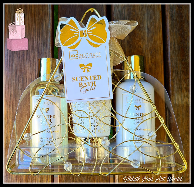 Set de baño de IDCInstitute. Es un set cuqui que viene muy bonito presentado en un triángulo dorado con unas bolitas que me parece muy mono para, por ejemplo, portavelas en Navidad. Trae gel de baño, crema de manos y loción corporal; que huelen muy bien. Lo tengo reservado para si, algún día, es posible hacer algún viaje. Que va genial para llevar.